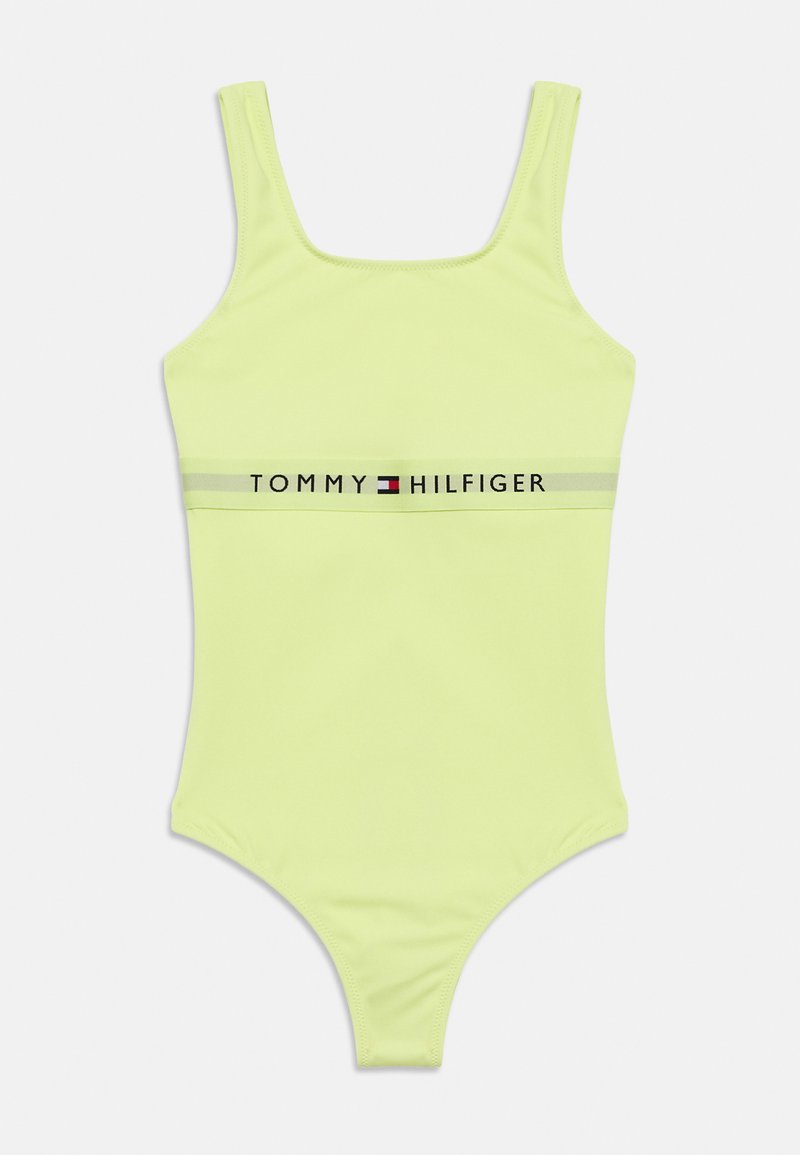 Φωτεινό πράσινο ολόσωμο μαγιό με χοντρές τιράντες στους ώμους και ελαστική ταινία με το εμπορικό σήμα "Tommy Hilfiger" στο στήθος.