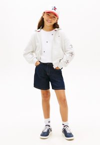 Κορίτσι με μακριά καστανά μαλλιά, που φοράει λευκό φούτερ με φερμουάρ και σχέδια αστεριών, και σκούρες τζιν σορτς, μπροστά σε ένα απλό φωτεινό φόντο.