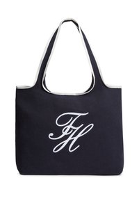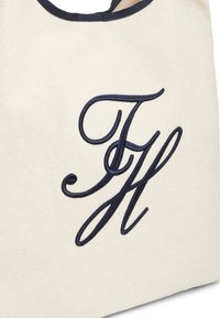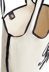 Γυναίκα με σγουρά μαλλιά που φοράει ελαιδί φόρεμα με κουμπιά, κρατώντας μια μεγάλη λευκή τσάντα καμβά με μαύρη γραφή και περιθώριο.