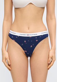 Γυναίκα που στέκεται ξυπόλητη πάνω σε χαλί, φοράει λευκό σουτιέν και εσώρουχο με μπλε λουλούδια και ζώνη με το λογότυπο Tommy Hilfiger, ανοιχτό γκρι φόντο.