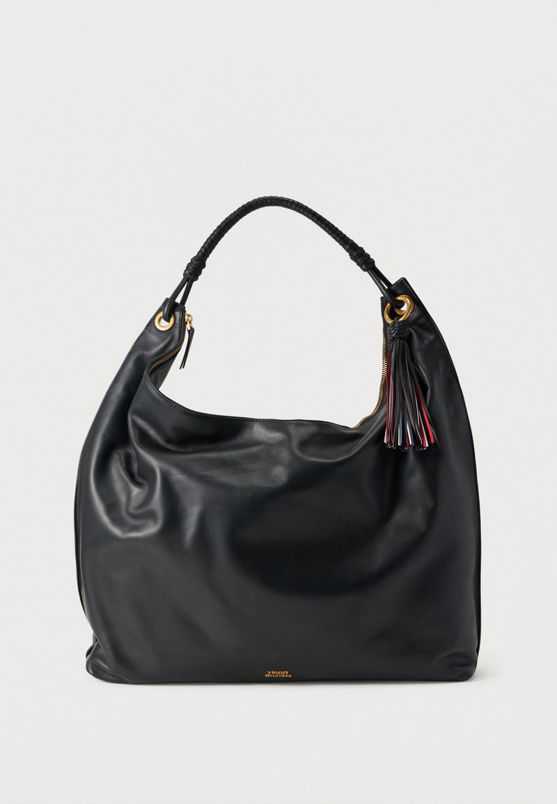 Μαύρη δερμάτινη τσάντα hobo με V-σχήμα άνοιγμα, που διαθέτει χρυσό λογότυπο μπροστά και ένα μικρό καφέ θήκη καρτών προσαρτημένη.