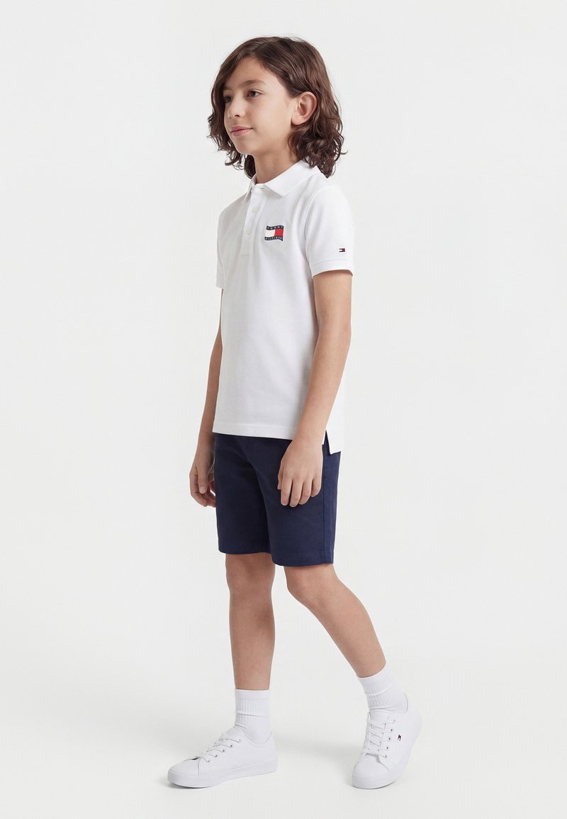 Αγόρι με μαλλιά μέχρι τους ώμους που στέκεται, φοράει λευκό πόλο με λογότυπο σημαίας, σκούρο μπλε σορτς, λευκές κάλτσες και λευκά αθλητικά παπούτσια.