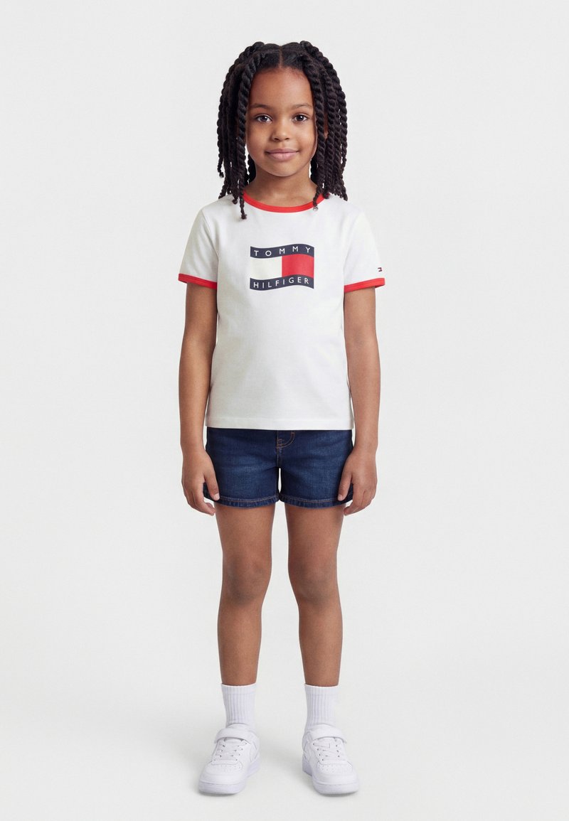 Νεαρή κοπέλα όρθια, φοράει λευκό t-shirt Tommy Hilfiger με κόκκινη διακόσμηση, σκούρες τζιν βερμούδες, λευκές κάλτσες και λευκά αθλητικά, μπροστά σε απλό φόντο.