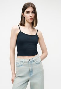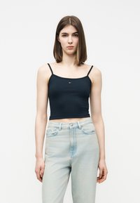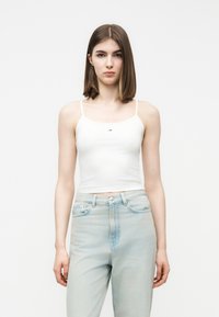 Νεαρή γυναίκα φοράει μαύρο κοντό τοπ χωρίς μανίκια, ανοιχτόχρωμα φαρδιά τζιν παντελόνια, μπεζ παπούτσια και κρατά μια μικρή μαύρη τσάντα χειρός.
