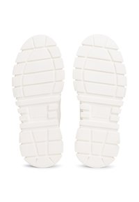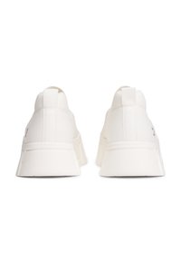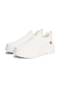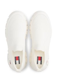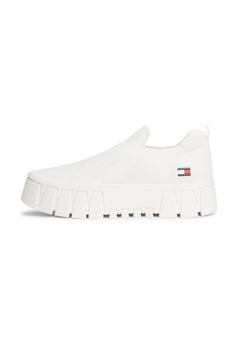 Λευκό αθλητικό παπούτσι slip-on με παχύ, ογκώδες πάτο και λογότυπο Tommy Jeans στο πίσω μέρος της φτέρνας, από την εξωτερική πλευρά.