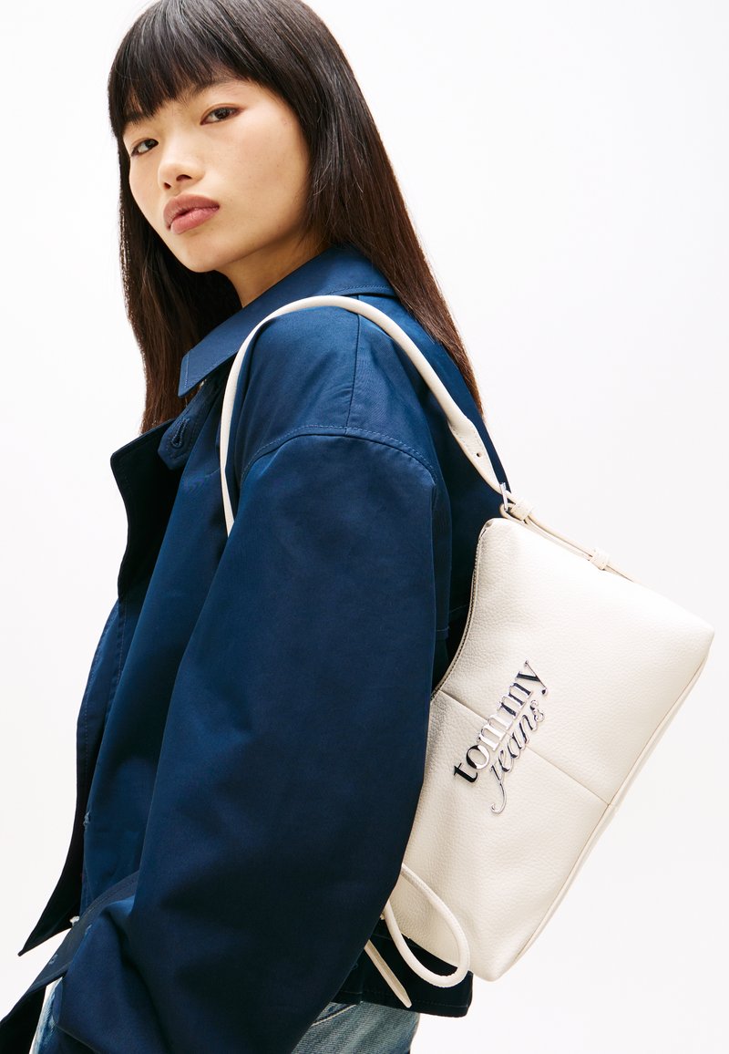 Γυναίκα με μακριά σκούρα μαλλιά που φοράει μπλε παλτό, κρατώντας μια λευκή τσάντα ώμου Tommy Jeans πάνω σε απλό φόντο.