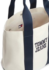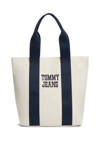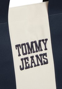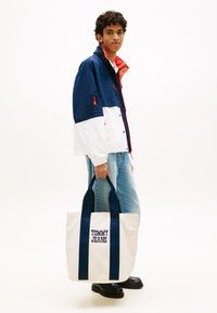 Νέος άνδρας που φοράει μπουφάν σε μπλε ναυτικό, άσπρο και κόκκινο χρώμα και τζιν παντελόνι, κρατώντας μια λευκή τσάντα tote με μπλε ναυτικές λαβές και το λογότυπο "Tommy Jeans".