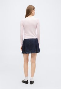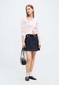 Νεαρή γυναίκα που φοράει ανοιχτό ροζ ζακέτα με κουμπιά και σκουρόχρωμη μπλε πλισέ τζιν φούστα με μαύρη ζώνη, στέκεται μπροστά σε απλό φόντο.