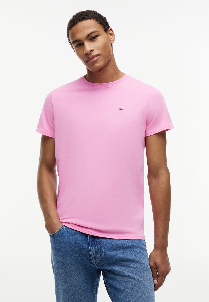 Νέος άνδρας που φορά απλό ροζ κοντομάνικο μπλουζάκι και τζιν μπλε παντελόνι, στέκεται με το ένα χέρι στην τσέπη, σε λευκό φόντο.