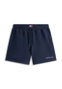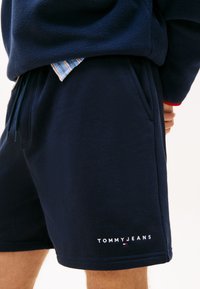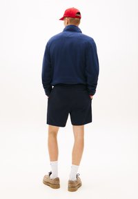 Άνδρας που φοράει σκούρα μπλε σορτς, λευκές μακρές κάλτσες, καφέ σουέτ παπούτσια και σκούρα μπλε πουλόβερ με ορατό ριγωτό τελείωμα πουκάμισου.
