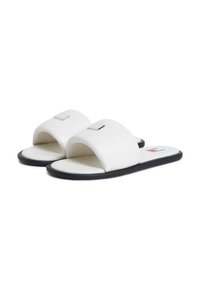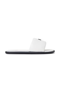 Λευκό σανδάλι με φαρδιά λουρί, μαύρη σόλα και χαμηλό επίπεδο τακούνι, εμφανιζόμενο σε προφίλ από το πλάι σε απλό λευκό φόντο.