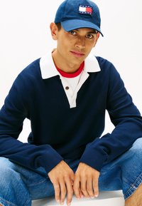 Νεαρός άνδρας που φοράει μπλε σκούρο πουλόβερ πάνω από λευκό πουκάμισο με γιακά και κόκκινη μπλούζα, μπλε τζιν και μπλε καπέλο με ορθογώνιο λογότυπο.