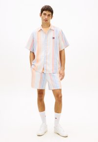 Νέος άνδρας που φοράει κοντομάνικο πουκάμισο με κάθετες ρίγες σε μπλε, πορτοκαλί και κόκκινο και λογότυπο Tommy Jeans στο στήθος.