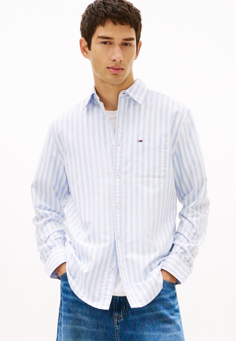 Νέος άνδρας που φοράει ένα πουκάμισο με κουμπιά σε ανοιχτό μπλε και λευκές ρίγες πάνω από ένα λευκό μπλουζάκι, με τα χέρια στις τσέπες και μπλε τζιν.