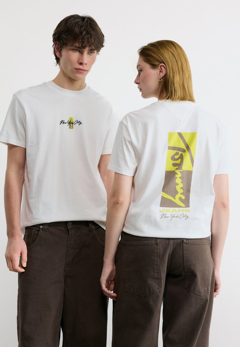 Νέος άνδρας με πρόσωπο προς τα εμπρός και νέα γυναίκα στραμμένη στο πλάι, φορούν λευκά γραφικά t-shirts με «New York City» και καφέ παντελόνια σε λευκό φόντο.