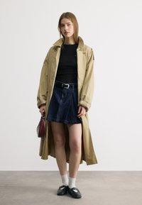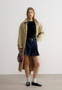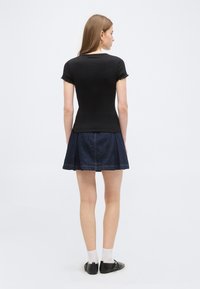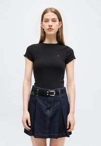 Νεαρή γυναίκα που φοράει μαύρο εφαρμοστό τοπ με κοντά μανίκια και σκούρο μπλε τζιν φούστα με μαύρη ζώνη, στέκεται μπροστά σε απλό φόντο.