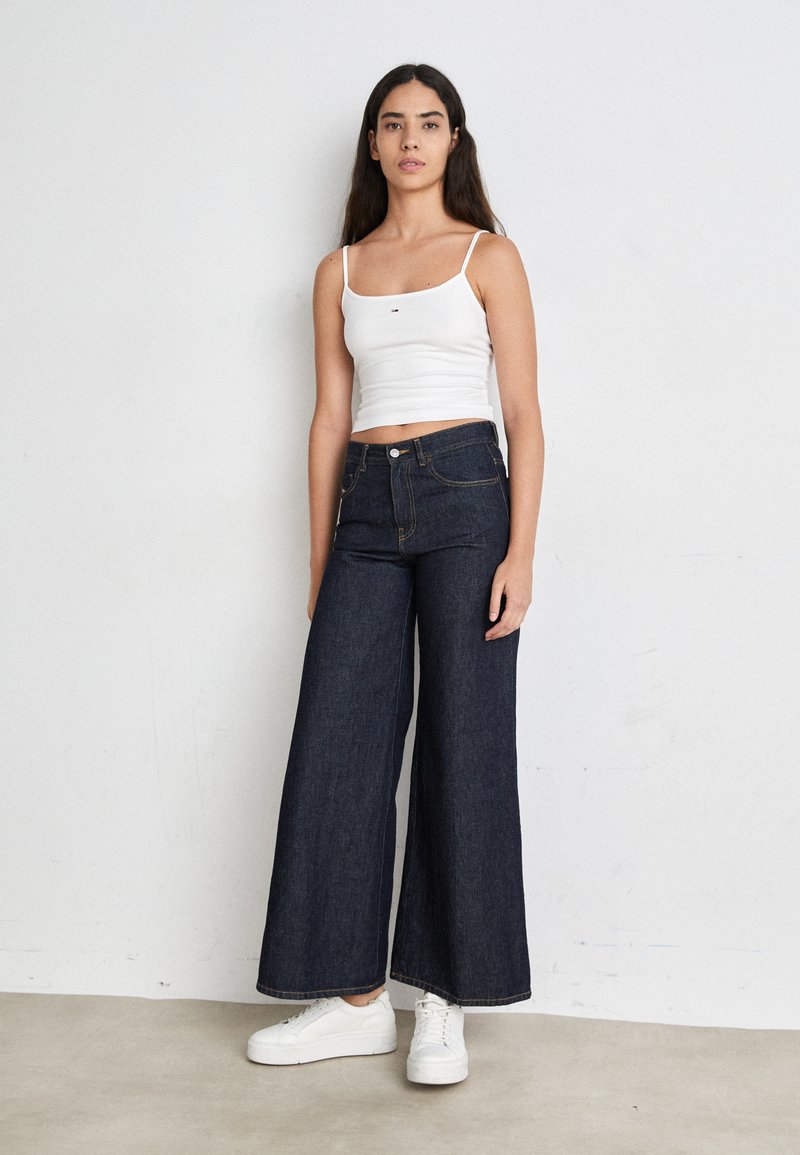 Γυναίκα που στέκεται σε λευκό τοίχο, φορώντας άσπρο κοντό τοπ, φαρδιά σκούρα τζιν και άσπρα sneakers με πλατφόρμα.