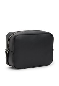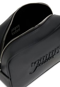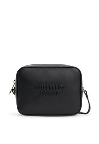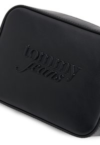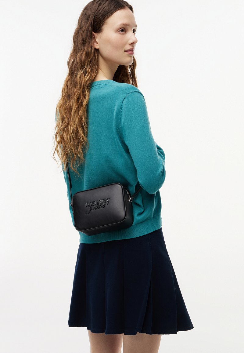 Γυναίκα με μακριά κυματιστά μαλλιά φοράει πετρόλ πουλόβερ, σκούρο μπλε φούστα και μαύρη τσάντα χιαστί Tommy Jeans σε απλό φωτεινό φόντο.