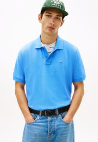 Νεαρός άνδρας που φοράει πράσινο καπέλο Tommy Jeans, ανοιχτό μπλε πόλο μπλούζα, ριγέ μπλουζάκι από κάτω και μπλε τζιν με μαύρη ζώνη.