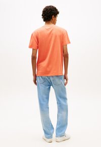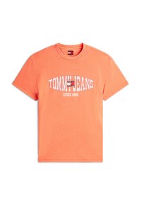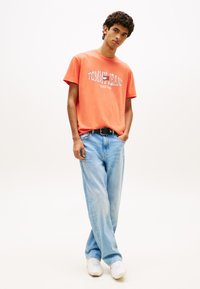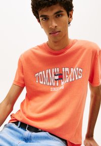 Νέος άνδρας που φοράει κοραλί μπλουζάκι Tommy Jeans και ανοιχτόχρωμο τζιν, με το ένα χέρι στην τσέπη, μπροστά σε απλό φόντο.