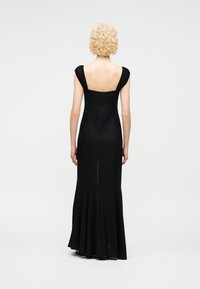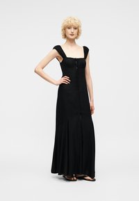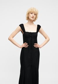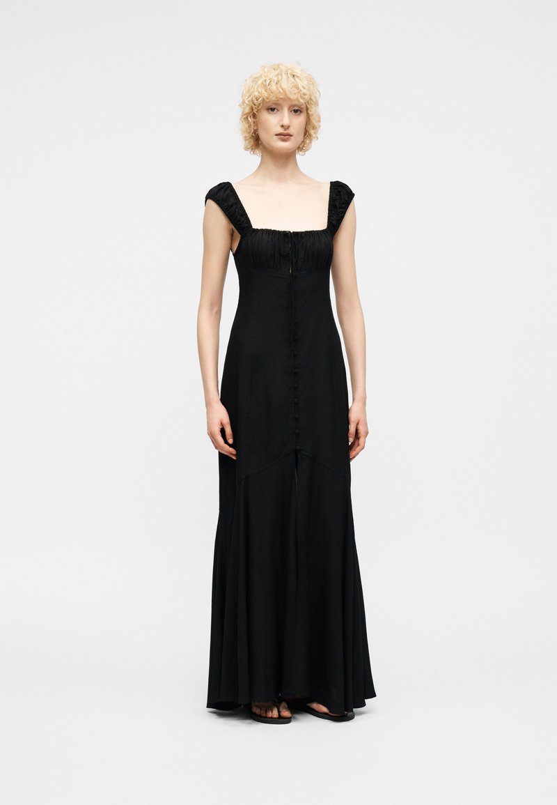 Γυναίκα με ξανθά, σγουρά μαλλιά φορώντας ένα μακρύ μαύρο φόρεμα χωρίς μανίκια με κουμπιά μπροστά και μαύρα σανδάλια ανοιχτής μύτης.