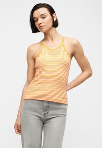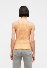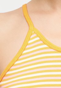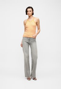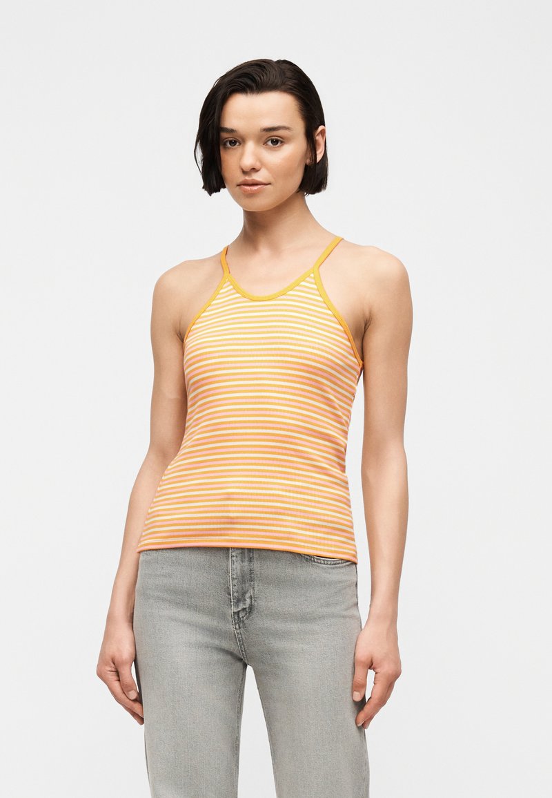 Νεαρή γυναίκα με κοντά σκούρα μαλλιά, που φοράει αμάνικη κίτρινη και πορτοκαλί ριγέ μπλούζα και ανοιχτό γκρι τζιν, στέκεται μπροστά σε λευκό φόντο.