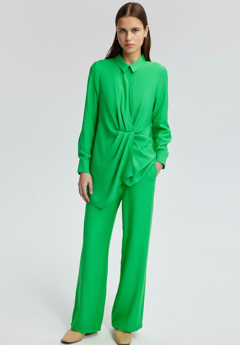 Γυναίκα που φοράει μια φωτεινή πράσινη μπλούζα με μακριά μανίκια και γιακά, με εμπρόσθια ρυτιδωμένη σχεδίαση, παντελόνι φαρδιάς γραμμής στο ίδιο χρώμα και καφέ μυτερά παπούτσια, στέκεται μπροστά σε απλό φόντο.