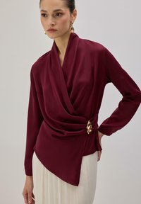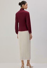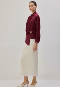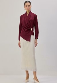 Γυναίκα που φοράει μπλούζα μάο σε μπουρντόρι με χρυσό τσιμπιδάκι, λευκή πλισέ φούστα, χρυσά σκουλαρίκια και μπεζ τακούνια, στέκεται μπροστά σε απλό φόντο.
