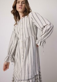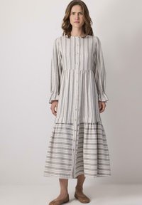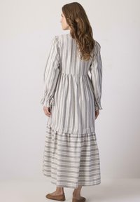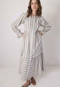 Γυναίκα με κυματιστά καστανά μαλλιά, ντυμένη με μακρύ, λευκό και γκρι φόρεμα με κατακόρυφες ρίγες και κουμπιά, φορώντας καφέ πλεκτά παπούτσια, ποζάρει με τα χέρια στη μέση.