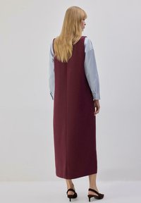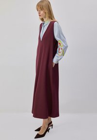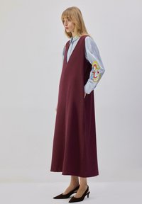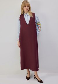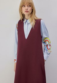 Ξανθιά γυναίκα που φοράει βυσσινί αμάνικο φόρεμα πάνω από ένα ανοιχτό μπλε πουκάμισο με πολύχρωμες κεντημένες μανσέτες και μαύρες γόβες, στέκεται μπροστά σε γκρι φόντο.