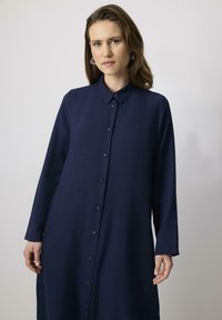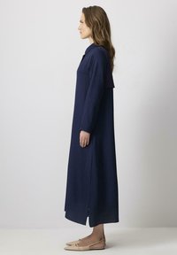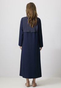 Γυναίκα που στέκεται με το πρόσωπο προς τα εμπρός, φορώντας ένα μακρύ μπλε σκούρο φόρεμα με κουμπιά και μακριά μανίκια, καθώς και μπεζ επίπεδα παπούτσια, μπροστά από έναν απλό φόντο.