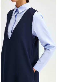 Γυναίκα που φοράει αμάνικο φόρεμα ναυτικού μπλε πάνω από γαλάζιο πουκάμισο με γιακά, συνδυασμένο με μαύρες μυτερές γόβες και ασημένια σκουλαρίκια κρίκους.