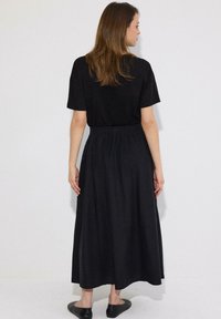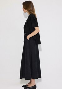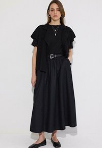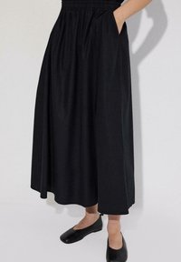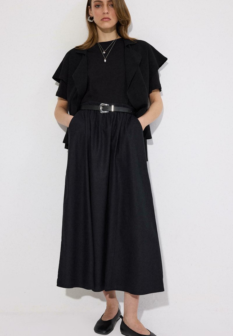 Γυναίκα που φοράει μαύρο τοπ με κοντά μανίκια, μαύρη φαρδιά φούστα με ζώνη, στρωμένο κολιέ, μαύρα φλατ παπούτσια, στέκεται μπροστά σε έναν λευκό τοίχο με τα χέρια στις τσέπες.
