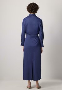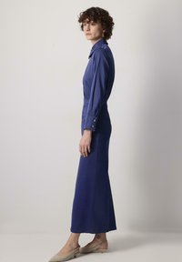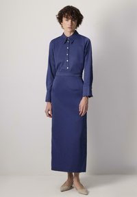 Γυναίκα που φοράει μακριά σατέν φούστα σε ναυτικό μπλε και αντιστοιχία τοπ με κυματιστές μανσέτες, συνδυασμένο με μπεζ μυτερά παπούτσια με χαμηλό τακούνι.