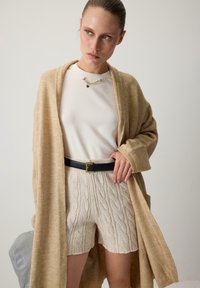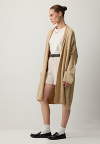 Γυναίκα με μακρύ μπεζ ζακέτα, λευκό πουκάμισο, πλεκτές σόρτς με μαύρη ζώνη, λευκές κάλτσες και μαύρα μοκασίνια, στέκεται μπροστά σε απλό φόντο.
