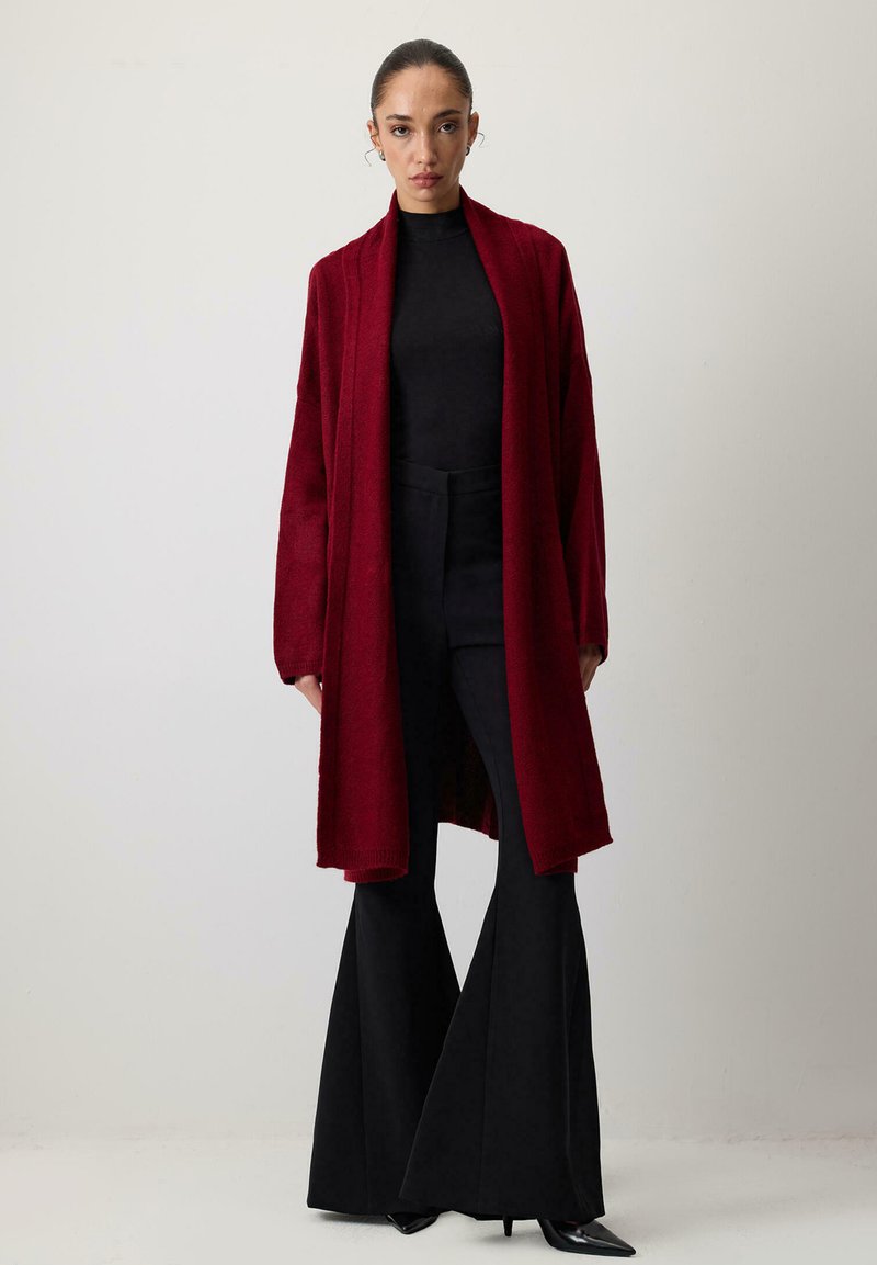 Γυναίκα που στέκεται φορώντας ένα μακρύ βουργουνδί ζακέτα, μαύρο ζιβάγκο, μαύρο καμπάνα παντελόνι και μαύρες γόβες με μυτερή μύτη, μπροστά σε απλό φόντο.