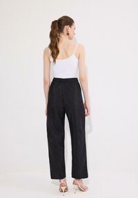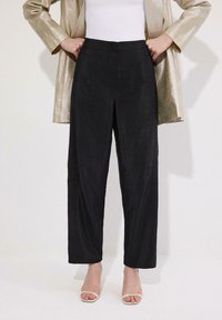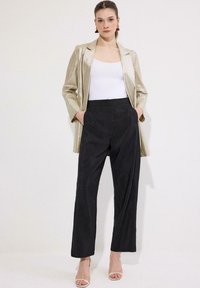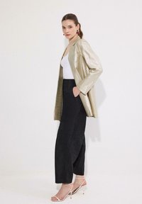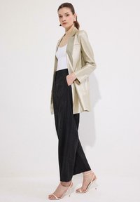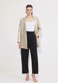 Γυναίκα φοράει ψηλόμεσο μαύρο παντελόνι φαρδιάς γραμμής, λευκή μπλούζα, χρυσό σακάκι και λευκά πέδιλα με ανοιχτά δάχτυλα, στέκεται με τα χέρια στη μέση.