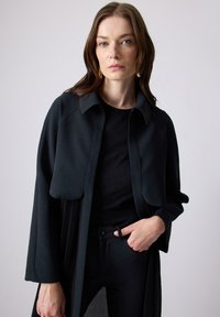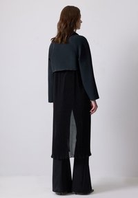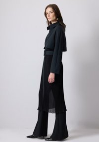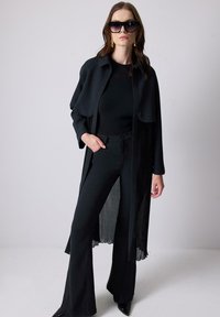 Γυναίκα με κυματιστά καστανά μαλλιά φοράει μακρύ μαύρο πλισέ παλτό με φαρδιά ζώνη, μαύρο παντελόνι με φαρδιά μπατζάκια και μαύρα μυτερά παπούτσια μπροστά σε λευκό τοίχο.