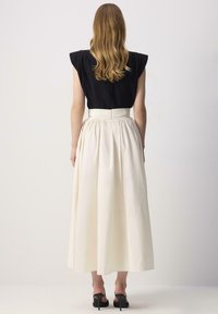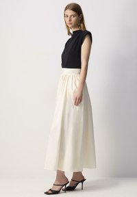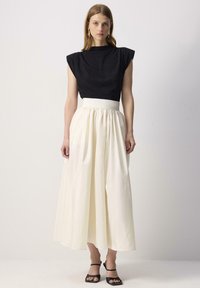 Γυναίκα που φοράει μια κρέμα maxi φούστα με πιέτες και ψηλό μέσο, μαύρα πέδιλα με τακούνια και μαύρο τοπ.