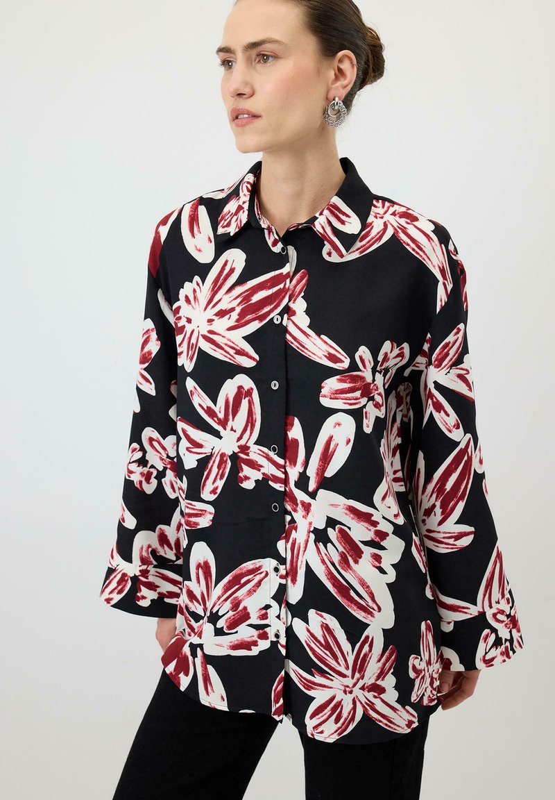 Μαύρο πουκάμισο με κουμπιά, με μεγάλο κόκκινο και λευκό ανθισμένο μοτίβο, μακριά μανίκια και άνετη εφαρμογή. Το ύφασμα φαίνεται λείο με ελαφριά γυαλάδα.