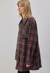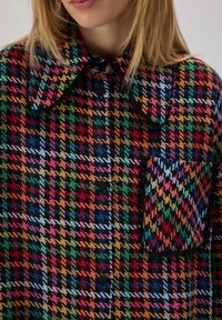 Νεαρή γυναίκα με ξανθά μαλλιά, φορούσα πολύχρωμο υπερμεγέθες πουκάμισο με καρό σχέδιο, μεγάλο γιακά και μπροστινή τσέπη, στέκεται μπροστά σε απλό φόντο.