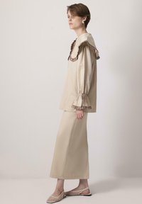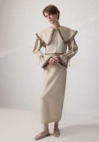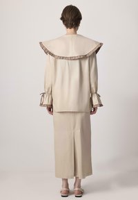 Νεαρή γυναίκα που στέκεται φορώντας μπεζ πουκάμισο με κουμπιά και υπερμεγέθη γιακά, μαζί με μακρύ φούστα στο ίδιο χρώμα, και πλεκτά παπούτσια, σε απλό φόντο.