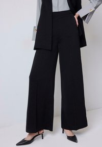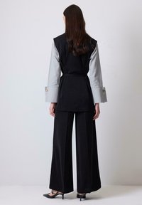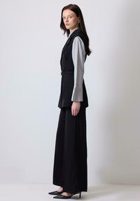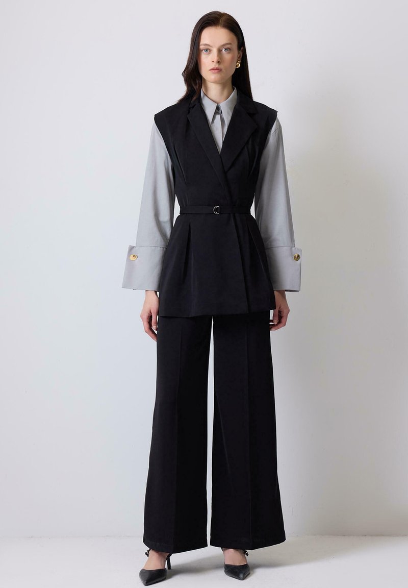 Γυναίκα όρθια, φορώντας ένα μαύρο αμάνικο μπλέιζερ με ζώνη πάνω από γκρι ανοιχτό πουκάμισο με φαρδιές μανσέτες, μαύρο παντελόνι φαρδιάς γραμμής και μαύρα τακούνια.
