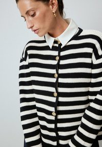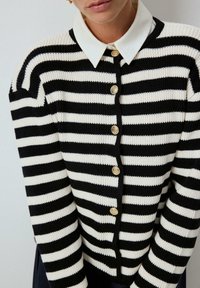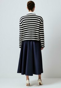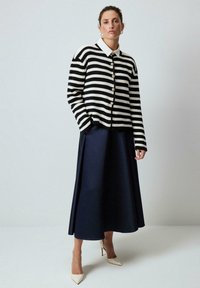 Γυναίκα που φοράει ριγέ ασπρόμαυρη ζακέτα με κουμπιά πάνω από λευκό πουκάμισο με γιακά, μπλε σκούρα midi φούστα και κρεμ μυτερά τακούνια, όρθια.