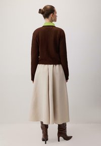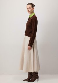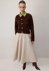 Γυναίκα που φοράει καφέ πλεκτή ζακέτα με μεγάλα κουμπιά και φωτεινό πράσινο γιακά, συνδυασμένη με λευκή φούστα, στέκεται μπροστά σε έναν τοίχο.