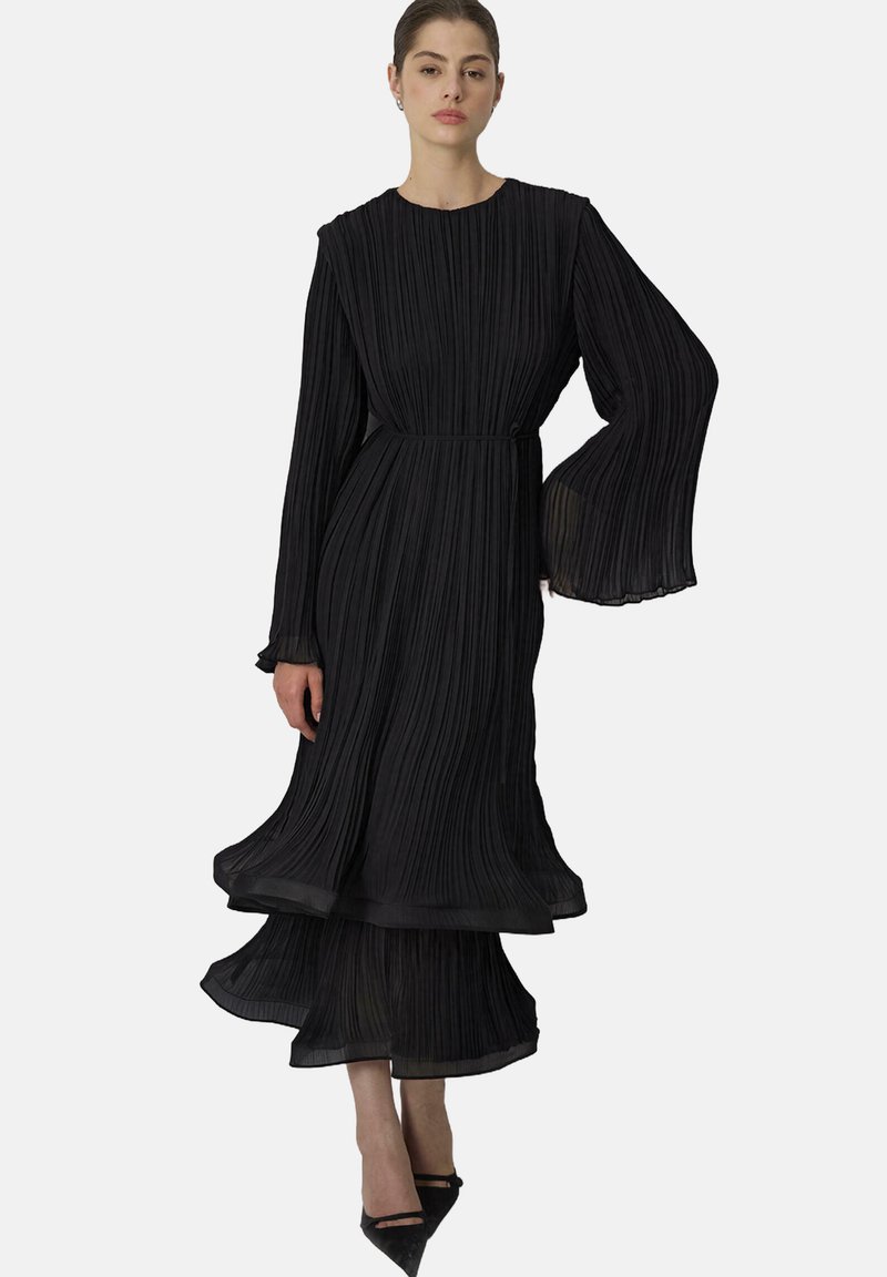 Γυναίκα που φοράει μακρύ μαύρο πλισέ φόρεμα με φαρδιά μανίκια και επίπεδο τελείωμα, συνδυασμένο με μαύρες μυτερές γόβες, στέκεται μπροστά σε λευκό φόντο.