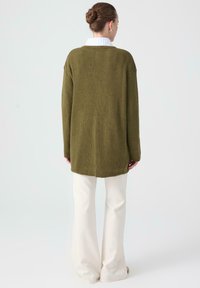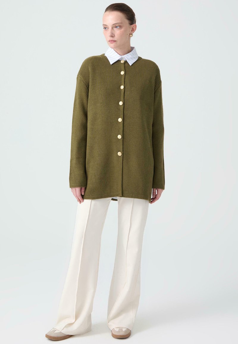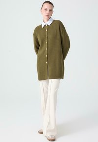 Γυναίκα που φοράει ελιάς πράσινο ριμπ πλεκτό ζακέτα με κουμπιά, λευκό πουκάμισο με γιακά, εκρού φαρδιά παντελόνια και μπεζ παπούτσια, στέκεται σε λευκό φόντο.
