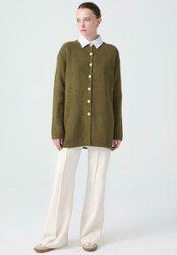 Νεαρή γυναίκα που φοράει πράσινη ελιάς ριγωτή πλεκτή ζακέτα με κουμπιά πάνω από λευκό και μπλε ριγέ πουκάμισο με γιακά, στέκεται μπροστά σε απλό ανοιχτόχρωμο φόντο.