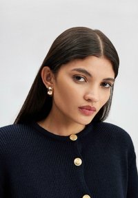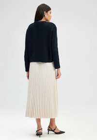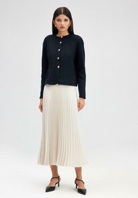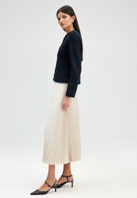 Γυναίκα που φοράει μπλε ναυτικό ζακέτα με χρυσά κουμπιά και λευκή πλισέ φούστα, στέκεται μπροστά σε ένα απλό φωτεινό φόντο.