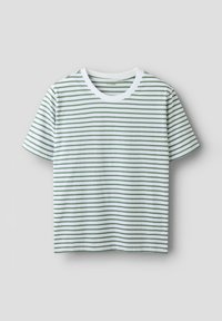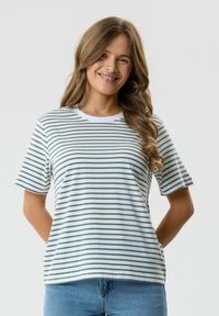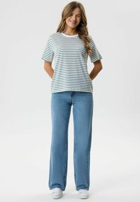 Νέα γυναίκα χαμογελά φορώντας λευκό και πράσινο ριγέ μπλουζάκι, ανοιχτό μπλε τζιν και λευκά αθλητικά παπούτσια, όρθια με τα χέρια πίσω από την πλάτη.